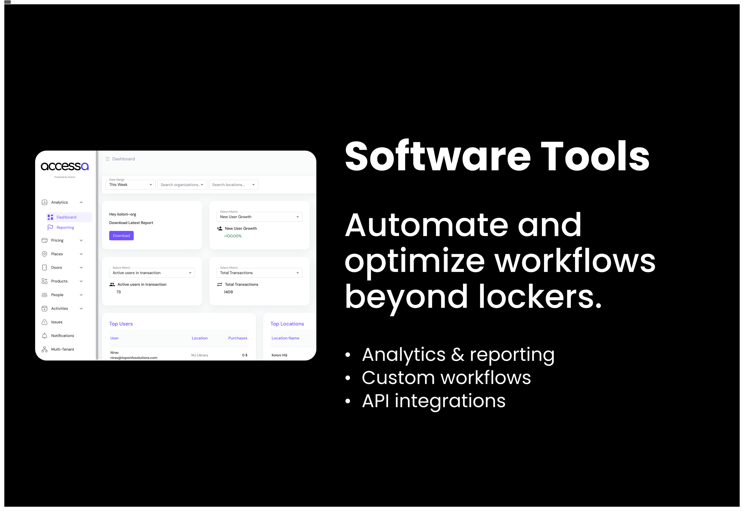 Workflow automation, reporting, and integrations beyond lockers.